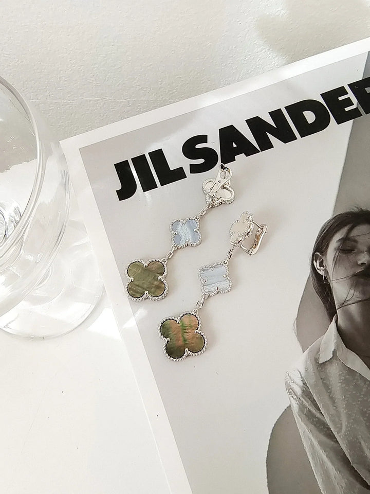 Indulge in luxury with our Clover 3 Motifs Chalcedony Dark Mop Silver Earrings. Adorn yourself with these elegant and exclusive earrings. featuring three delicate clover motifs made of chalcedony and dark mother of pearl on a shining silver base. Elevate your style and make a sophisticated statement.