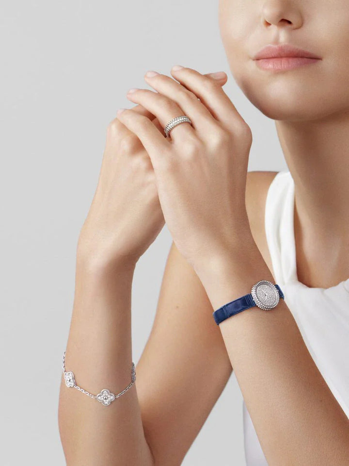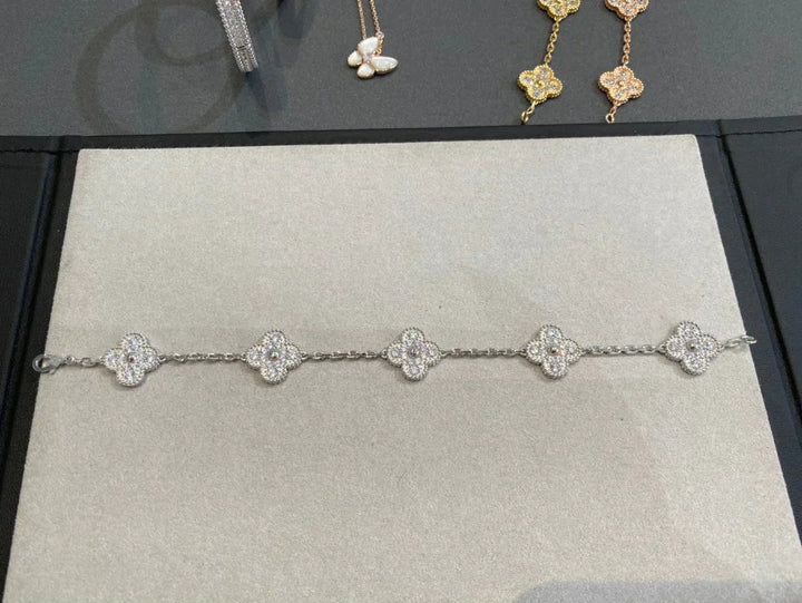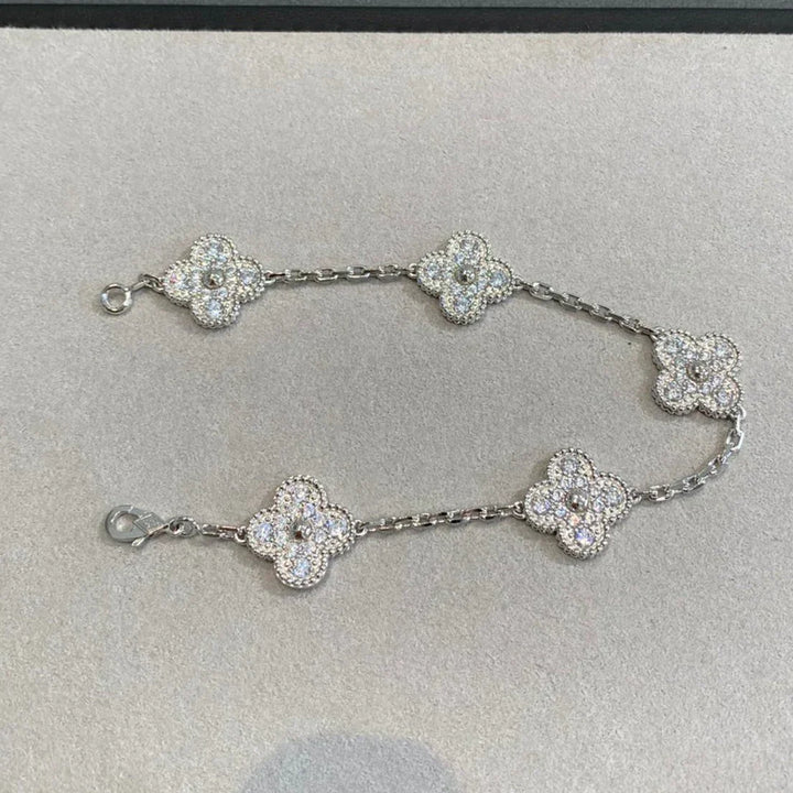 Elevate your style with our CLOVER 5 MOTIFS SILVER DIAMOND BRACELET. Crafted with intricate details and sparkling diamonds. this luxurious piece will add a touch of elegance and sophistication to any outfit. The five clover motifs symbolize luck and prosperity. making it the perfect accessory for any occasion. Treat yourself or someone special to this exclusive bracelet.