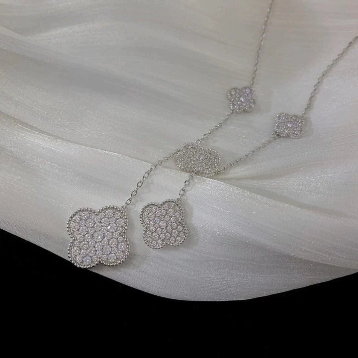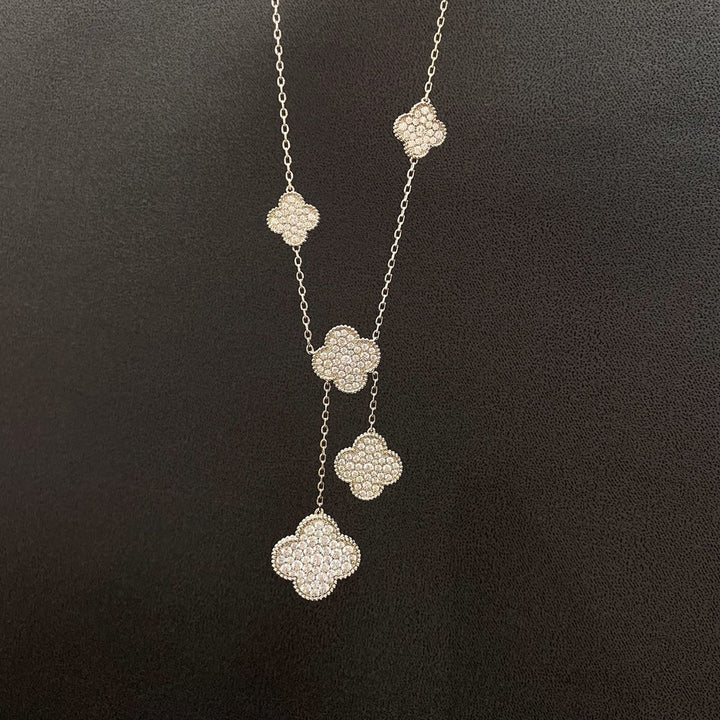 Indulge in the luxury of our Clover 5 Motifs Silver Diamonds Necklace. Crafted with intricate design and sparkling diamonds. this necklace will add a touch of elegance and sophistication to any outfit. A symbol of good luck. this necklace is a must-have for the fashion-forward and elite.