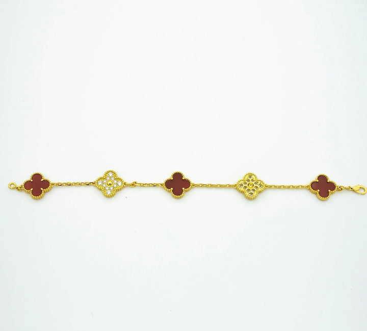 Elevate your style with our Clover Bracelet featuring 5 striking carnelian motifs and sparkling diamonds. Perfect for adding a touch of elegance to any outfit. You'll love the luxurious feel and eye-catching design of this stunning piece. Show off your unique beauty wherever you go.
