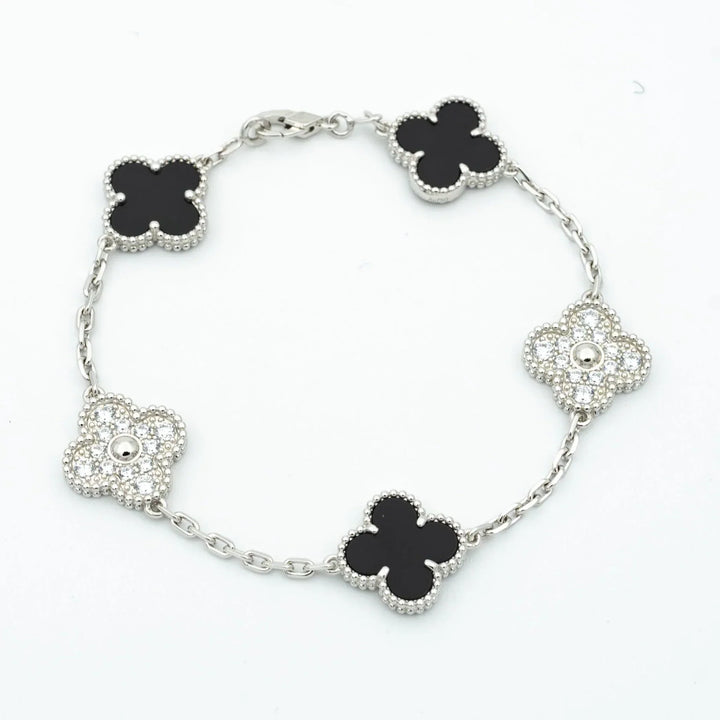 This clover bracelet features 5 motifs of onyx and sparkling diamond accents. Perfect for adding a touch of elegance and luck to any outfit. Made with high-quality materials for lasting beauty and style. The perfect gift for any occasion.