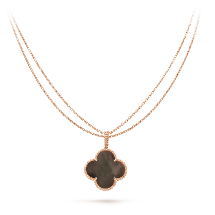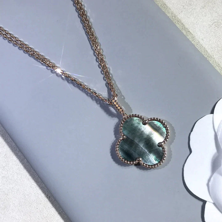 Elevate your style with our CLOVER GOLD DARK MOP BIG CLOVER NECKLACE. This stunning piece features a large clover pendant with dark mother of pearl detailing. adding a touch of sophistication and elegance to any outfit. Spoil yourself or someone special with this unique and eye-catching necklace.