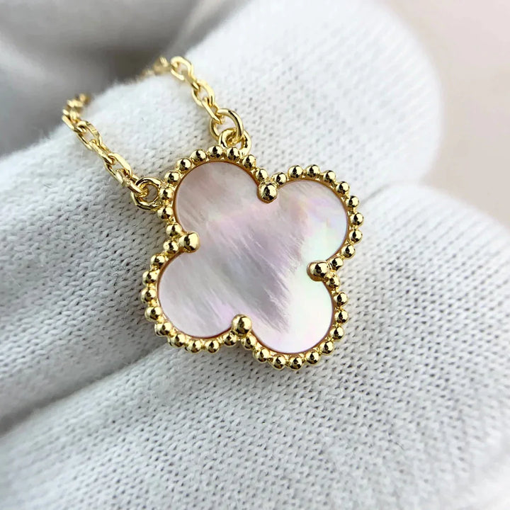 Elevate any outfit with our luxurious Clover Pendant Pink MOP Gold Necklace. Made with high-quality materials. this necklace boasts a stunning clover-shaped pendant with a pink mother-of-pearl inlay. accented by a delicate gold chain. Add a touch of sophistication and charm to your wardrobe with this timeless piece.