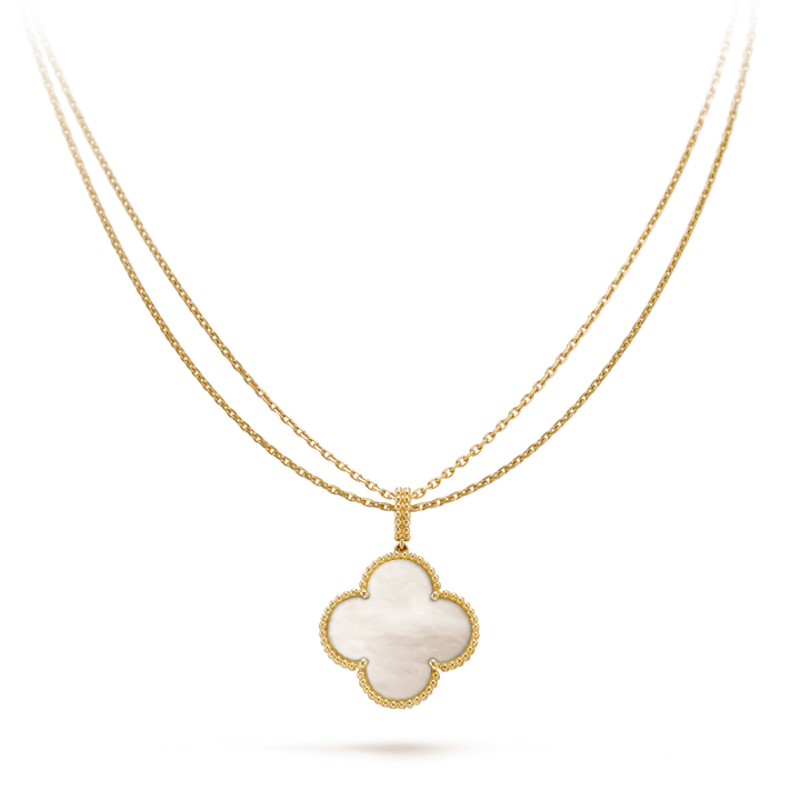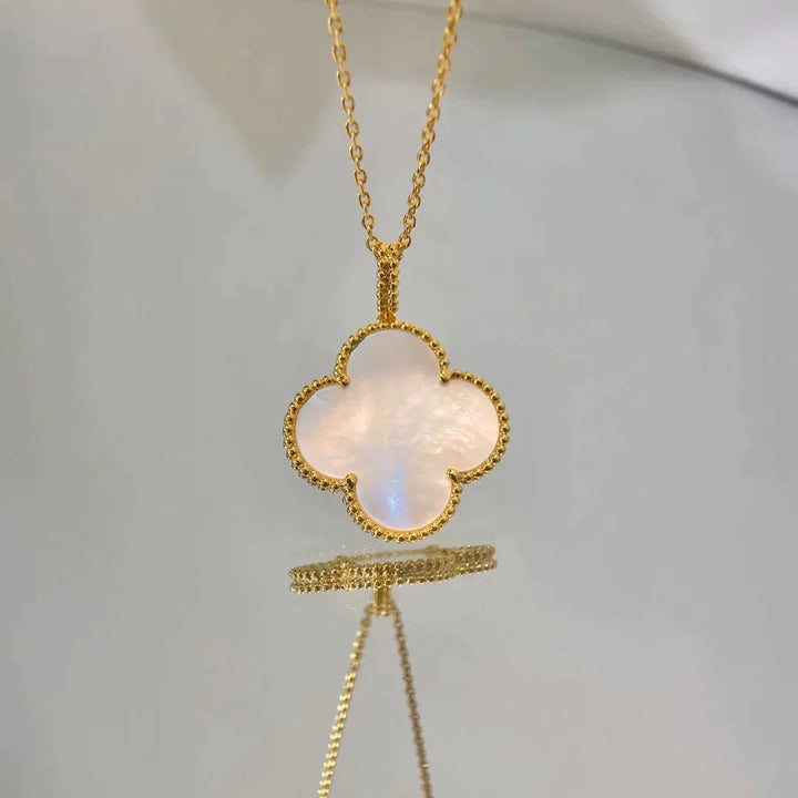 This exquisite CLOVER PINK MOP GOLD NECKLACE features a beautiful clover-shaped pendant made of pink mother of pearl. The pendant is set on a delicate gold chain. exuding sophistication and elegance. Perfect for adding a touch of luxury to any outfit.