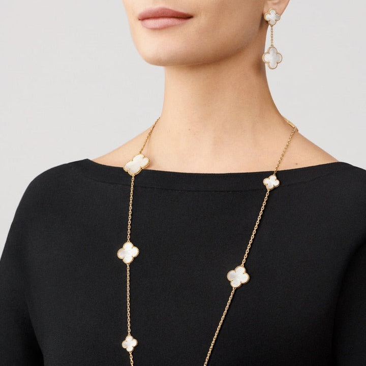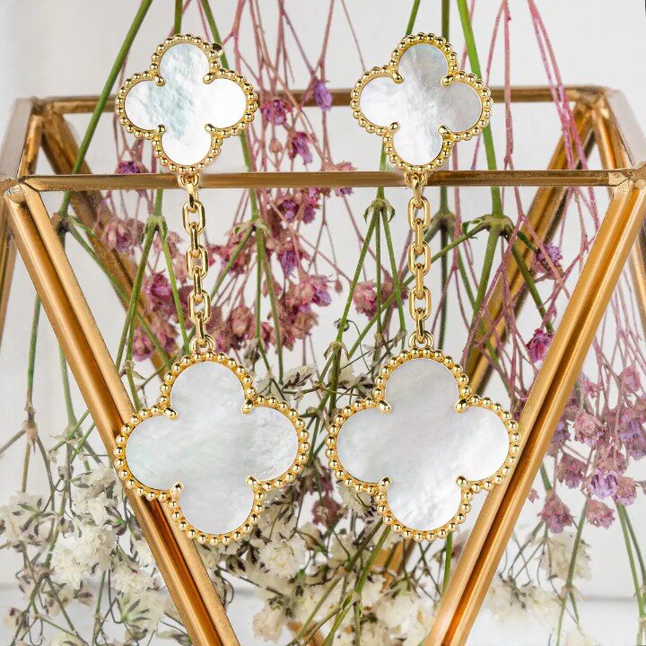 Discover the elegance of these Clover White MOP Earrings. Featuring two intricate motifs. these earrings are expertly crafted to add a touch of sophistication to any outfit. Made with premium materials. they offer timeless beauty and lasting durability. Elevate your style with these stunning earrings.