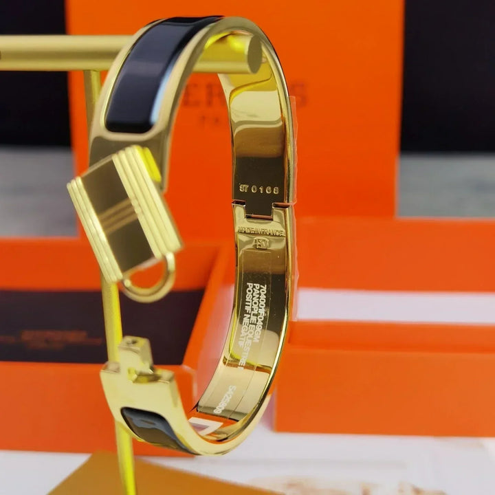This H Lock Bracelet is 12mm in size and designed to elevate your style. Featuring a sleek and modern lock. it adds a touch of sophistication to any outfit. Made with high-quality materials. this bracelet is a must-have for any fashion-forward individual looking to make a statement.
