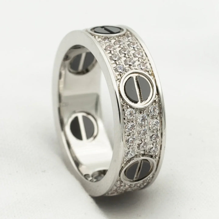 This LOVE RING is designed with 5.5MM diamonds paved on a ceramic band. adding a touch of elegance to any outfit. The diamonds sparkle brilliantly. creating a luxurious look and feel. Made with high-quality materials. this ring is durable and long-lasting. making it the perfect addition to any jewelry collection.