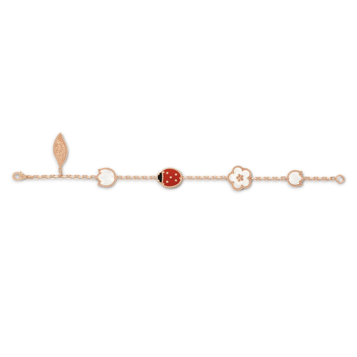 The LUCKY SPRING PINK GOLD BRACELET 5 MOTIFS features a stunning design with five motifs. showcasing the elegance of pink gold. It is a fortunate accessory that adds a touch of luck to any outfit. Crafted with precision and quality. this bracelet exudes a luxurious and refined style.