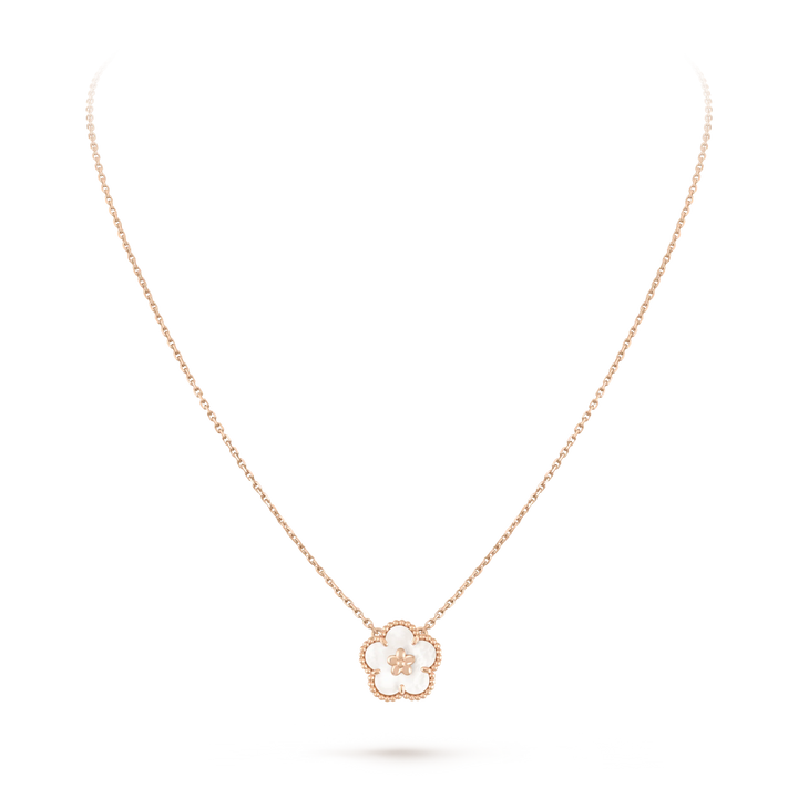 Embrace the beauty of nature with the Lucky Spring White Blossom Pink Gold Pendant. Made from high-quality materials. this pendant is delicately crafted to showcase a stunning white blossom design in pink gold. Pair it with any outfit for a touch of elegance and luck.