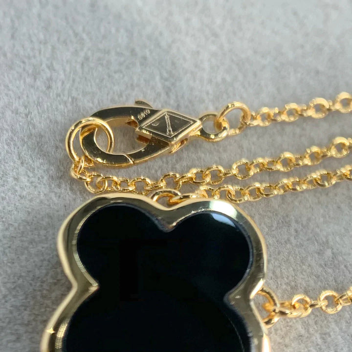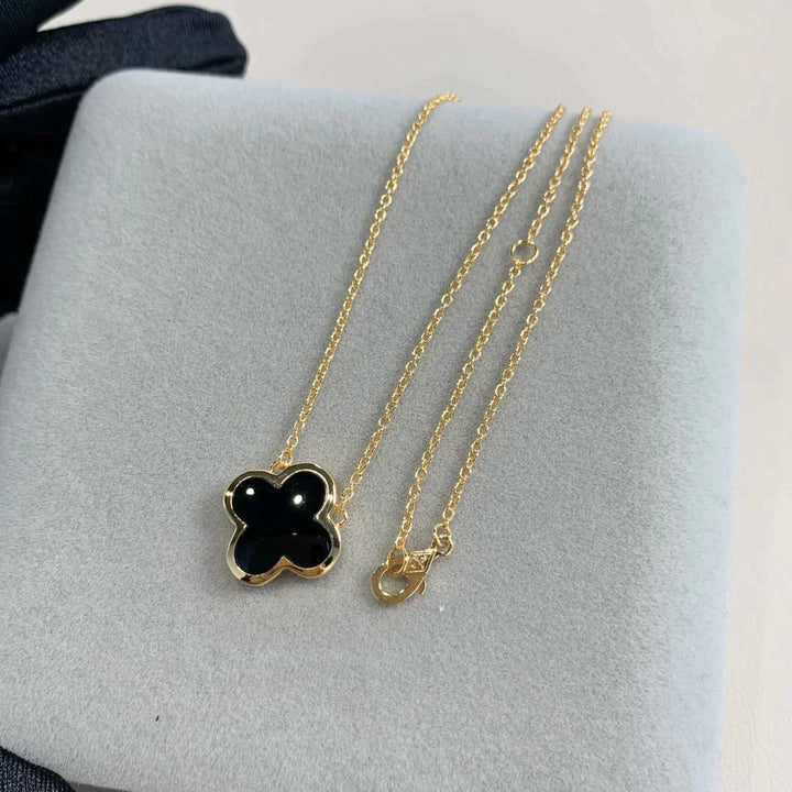 Get lucky with our PURE CLOVER PINK GOLD ONYX NECKLACE! Featuring a beautiful clover pendant with a stunning pink gold and onyx design. this necklace will add a touch of elegance to any outfit. Perfect for a night out or as a unique gift. (You won't be able to resist wearing it everyday!)
